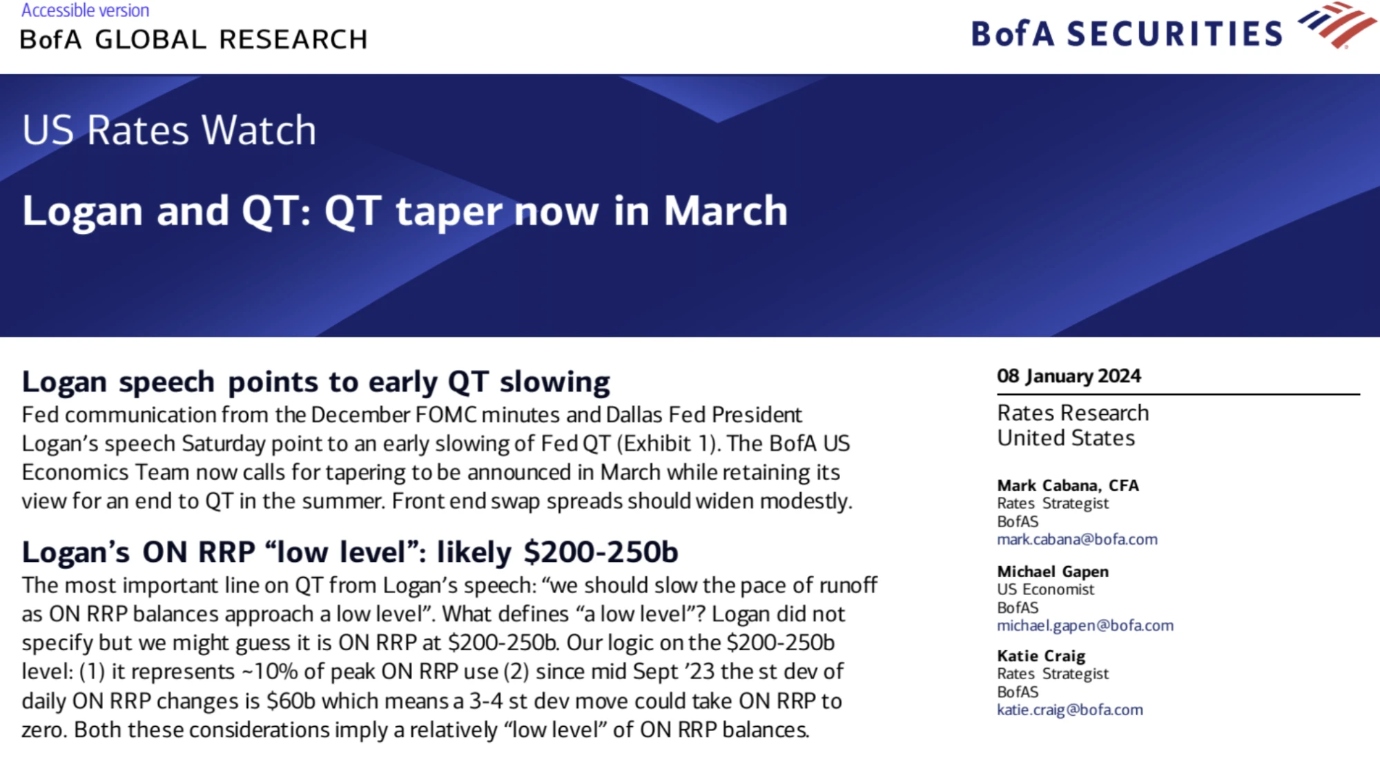美联储有意识到这个问题。两个关键事件,一是 1 月 3 号公布的 12 月份 FOMC 会议纪要显示,美联储已开始考虑缩减 QT 的时机和沟通方式。然后是 1 月 8 号达拉斯联储 Logan 今年开年的讲话明确建议,一旦 ON RRP 耗尽,QT 就应该缩减,因为比起提前降息,停止 QT 对通胀的影响会更小。