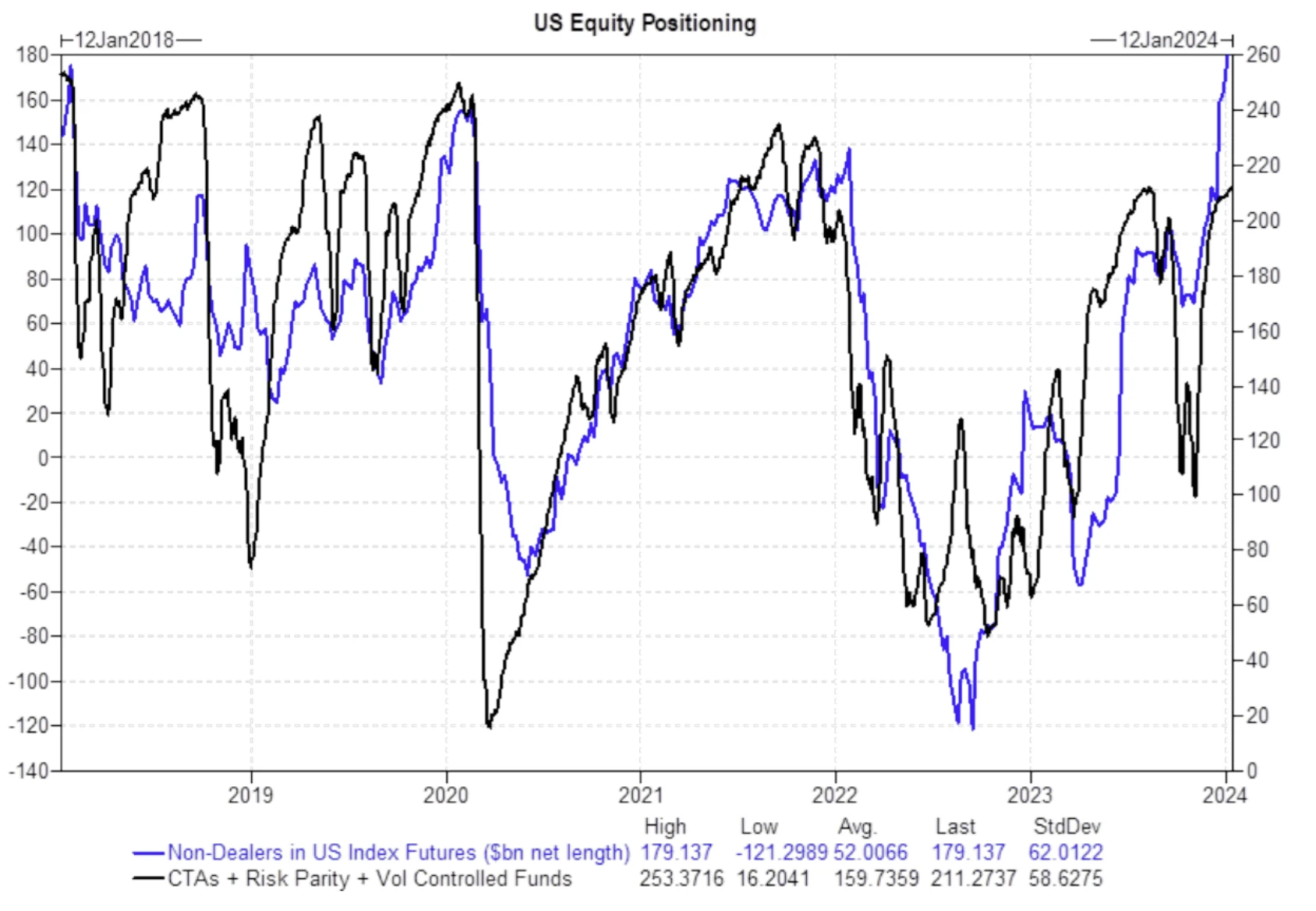 高盛:“多头头寸极端……美国股指期货的非交易商头寸处于历史高位。系统策略头寸(CTA + 波动控制 + 风险平价)接近一年高点。”