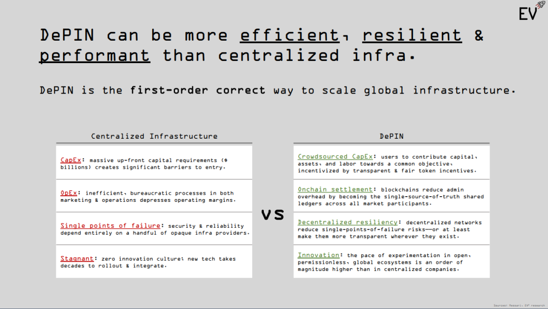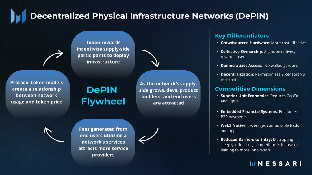 DePIN一词最早由Messari于年初提出,并通过研究报告The DePIN Sector Map正式定义,并为这一概念描绘出基本的版图。DePIN的核心目标是通过加密经济协议,在现实世界中部署物理基础设施和硬件网络,借助区块链的激励机制来推动各方参与者共同建设这一网络。