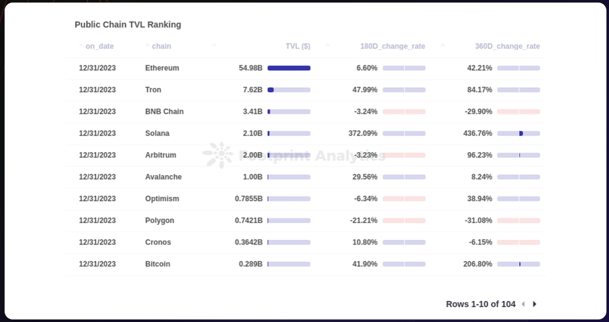在总锁定价值(TVL)方面,以太坊仍然保持领先地位,其 TVL 达到了 550 亿美元,占据了 760 亿美元 TVL 市场份额的 72.4%。Tron 以 76 亿美元排名第二,紧随其后的是BNB 链和 Solana,分别为 34 亿美元和 21 亿美元。对比 2022 年,Solana、比特币 Arbitrum 和 Tron 的 TVL 增长超过 80%,而 Polygon 和 BNB 链则出现了超过 20% 的下滑。