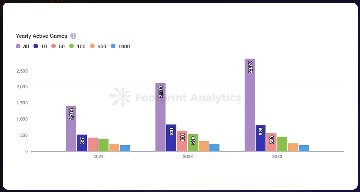 2023 年,区块链游戏市不断扩大,游戏数量从 2,110 款增至 2,878 款。然而,仅有 6.4% 的游戏月活跃用户(钱包)超过 1,000 人,较 2022 年的 10% 有所下降。在活跃游戏中,BNB 链、Polygon 和以太坊等主导型区块链占据了超过 80% 的市场份额,对市场产生了显著影响。