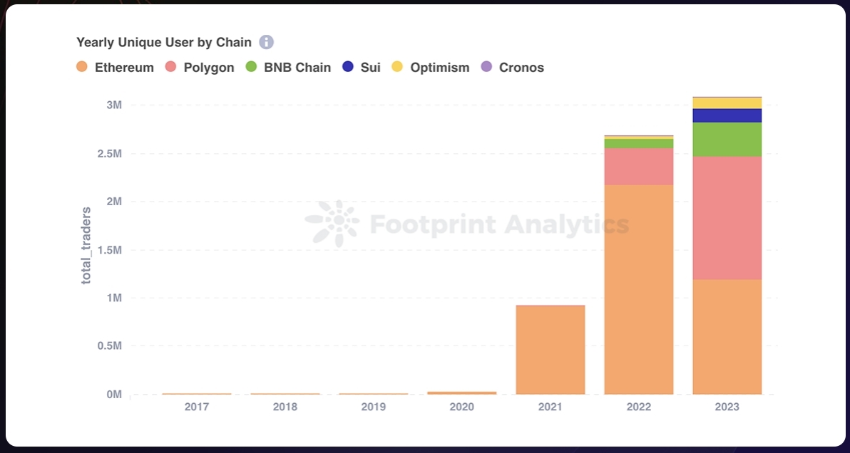 在 NFT 领域,尽管市场交易量达到 131 亿美元,但相比前一年的高峰有所下滑。 以太坊 仍然占据主导地位,市场份额达到 97.8%,但略有下降,表明市场正在出现多样化。 Polygon 的用户数量增长了 231.0%,达到 130 万;而以太坊的用户数量下降了 45.2%。与此同时, BNB 链 用户数量增长了 280.7%,达到 35.3 万。今年还由于比特币的 Ordinals 交易和 Solana 的 NFT 交易量增加,市场发生了重大变化。