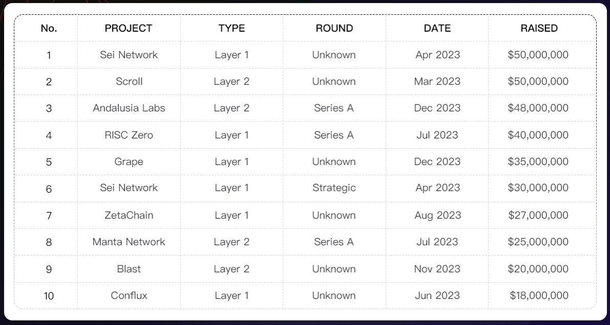融资方面,加密货币周期性依然存在——2023 年,公链项目在 70 轮融资中筹集了 5.39 亿美元,与 2022 年 37 亿美元的高点相比,年降幅达 85.5%。然而,在信心动摇的情况下,投资者对 Layer 2 基础设施依旧看好。在 2023 年的 70 轮融资中,Layer 2 融资占 41.4%,高于 2022 年的 34.5%。2023 年,Layer 2 平均融资额比 Layer 1 高出 15%。这些数据表明,尽管加密货币市场处于寒冬之中,但投资者越来越重视专业的构建者和技术创新,而非追逐短暂的炒作和泡沫。