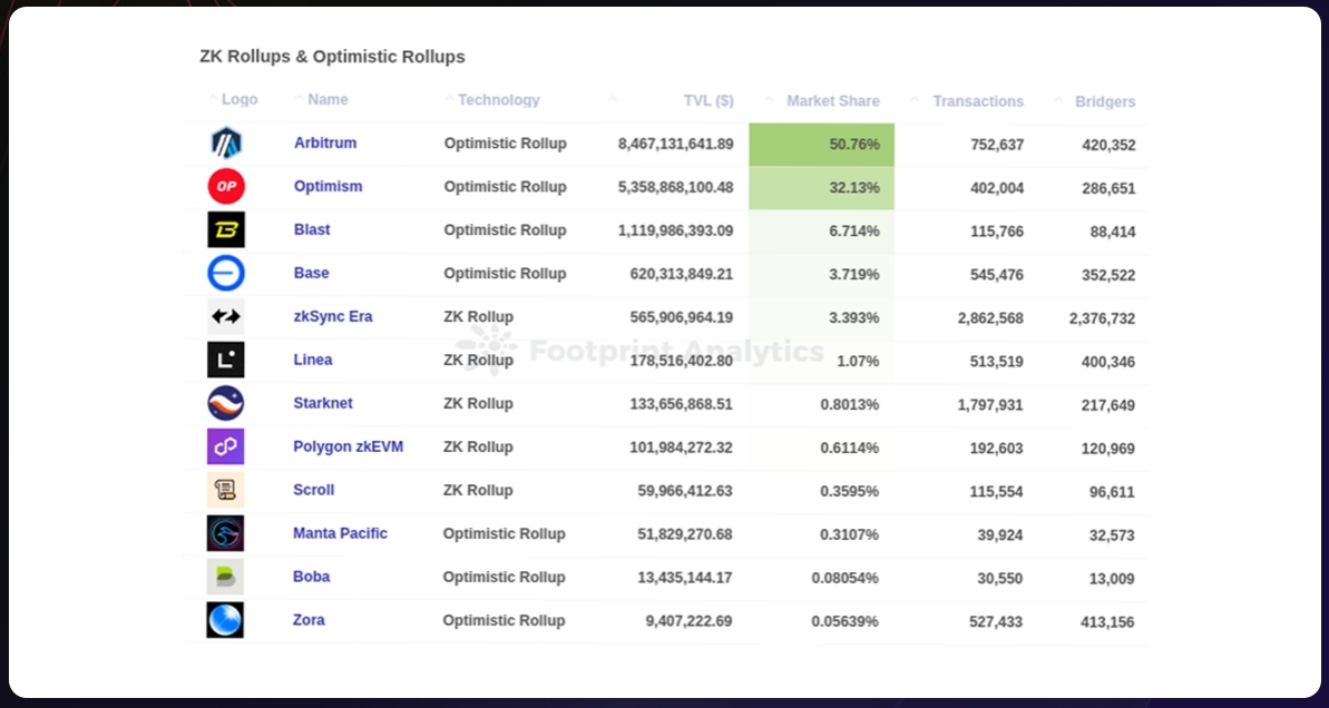 在以太坊 Layer 2 解决方案方面,Arbitrum 独占鳌头,占据了 50.8% 的市场份额,其 TVL 达到了 85 亿美元。紧随其后的是 Optimism ,占据了 32.1% 的市场份额,TVL 为 54 亿美元。值得注意的是,后起之秀 Blast 在短短 40 天内实现了 11 亿美元的 TVL,赢得了 6.7% 的市场份额。其他知名项目如 Base 和 zkSync Era 的市场份额分别为 3.7% 和 3.4%。在这个多元化的生态系统中,小型参与者与传统巨头的差距越来越小,这就像一个充满活力的珊瑚礁——多样化、竞争激烈、不断发展。(这里的“TVL”是指存放和锁定在 Layer 2 智能合约中的累计金额。)
