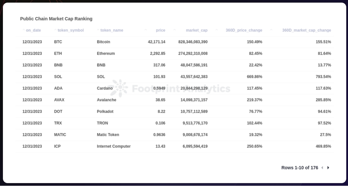 公链作为加密货币的重要基础设施,其发展状况对于整个行业具有深远影响。根据 Footprint Analytics 的数据,在 2023 年,公链加密货币的总市值达到了 1.3 万亿美元。其中比特币占据 62.2% 的份额, 以太坊 占据 20.6%, BNB 链 和 Solana 的份额分别为 3.6% 和 3.3%。值得一提的是,在这一年里,Solana、 Avalanche 、ICP、比特币 和 Cardano 的市值增长均超过了100%,展现了强劲的增长势头。