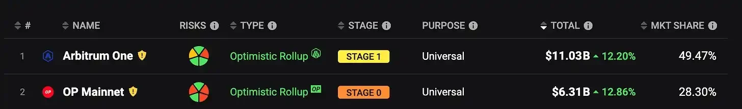 其中,Arbitrum 和 optimism 一直在吸引项目和人才在 L2 基础上进行激烈的竞争——通常被称为 L2 之战。