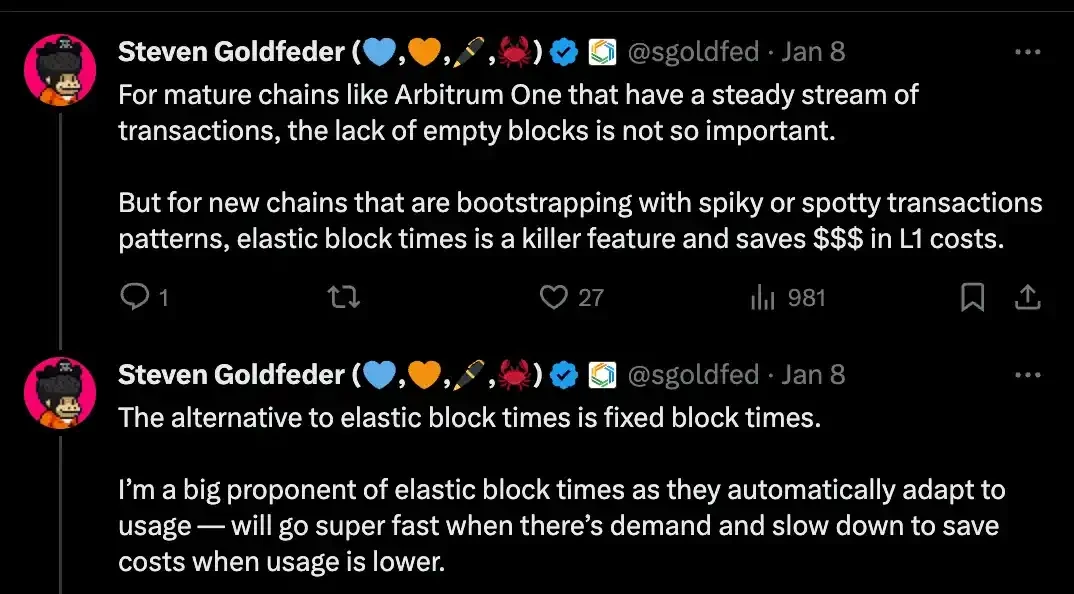 Arbitrum Orbit 与其他 L2 竞争对手的区别之一是「弹性区块时间」,即 Orbit 根据需求弹性生产区块。