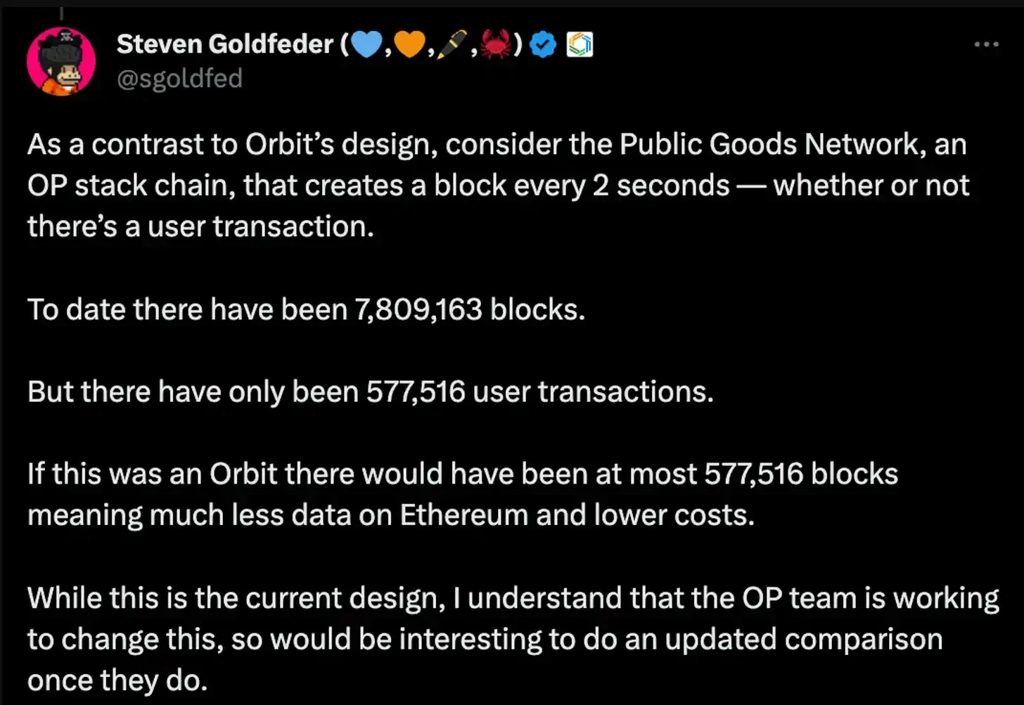 Orbit 的弹性区块时间让他们在 L1 区块结算方面节省了金钱,因为不会产生空区块,也不会浪费金钱。