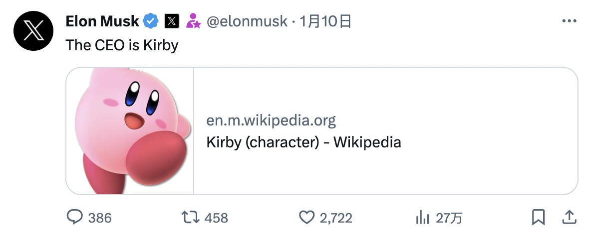 马斯克在这则帖子下开玩笑式的随口评论,“卡比是 CEO。”这也让星之卡比成为了一个短期内爆火的 meme 概念。
