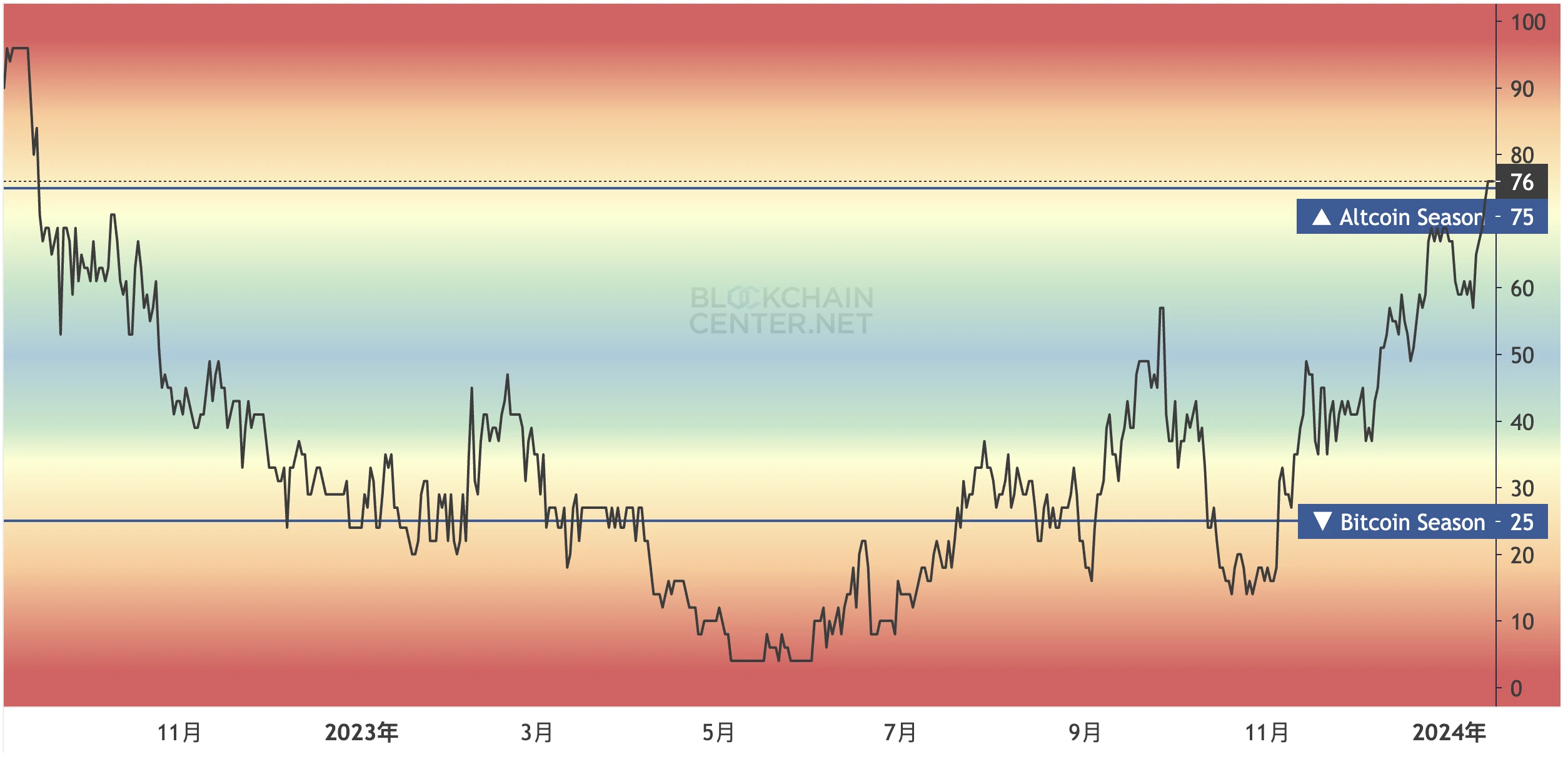 目前,市场已经全面进入 meme 狂热季。B lockchaincenter.net 年的山寨季指数显示,当前山寨季指数高达 76 。 该指标表明,在过去 90 天内,前 50 种山寨币中有 75% 的币种表现优于比特币。