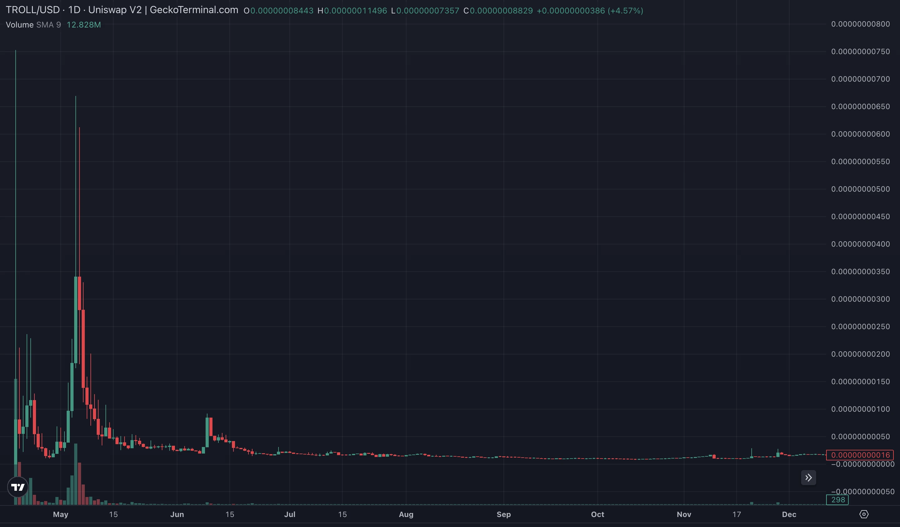 更为有趣的是,TROLL 的上涨是阴差阳错,该代币近日才并非应运而生的马斯克概念 meme 币,而是早在 2023 年 4 月就已部署。 在马斯克成为首席巨魔官之前,该代币价格早已从最高点跌去 98% 。这是一款名副其实的“归零币”。