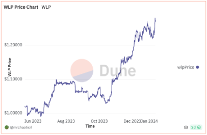 WINR 的 LP 代币(WLP)价值已从 1 美元增长至约 1.27 美元(如果在 2023 年 7 月 1 日左右开始 LP,表明了 27% 的回报)