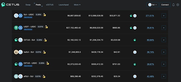 目前部分流动性池子获得Sui官方的流动性激励,获得CETUS奖励的同时还可获得SUI代币奖励。
