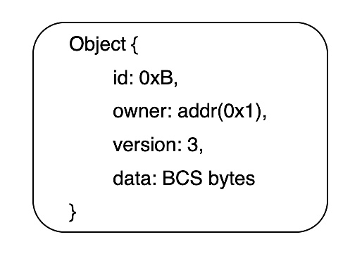 Sui 的特点是采用以对象为核心的数据模型。 每个对象会存储一个全局的,唯一的ID、一份所有者的元数据、一个版本号 (version:每次该对象被调用后会加1) 和二进制规范序列化数据 (Binary Canonical Serialization) ,如下图所示: