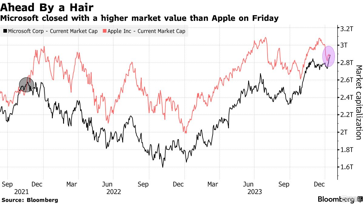 当地时间1月12日,苹果小幅上涨0.18%,而微软收涨1%,以2.89万亿美元的市值超越了苹果(2.87万亿),实现了全球市值最高公司宝座的易主。此前11日,两者就已经“短兵相接”,微软短暂超越苹果,而后又被苹果超越。这种胶着的战况,已经表明,苹果的“世界第一”,越来越难坐稳了。