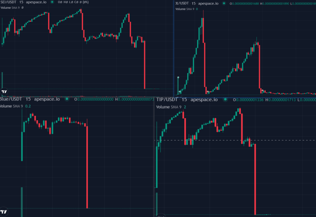 假 SEI、假 X、假 TIP 和假 Blue 几个代币的波动图如下: