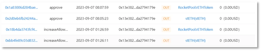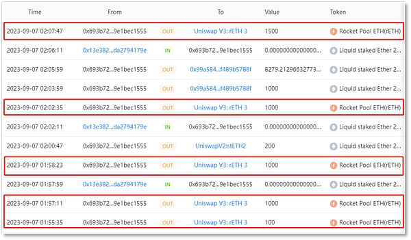 将盗取的 stETH 和 rETH 兑换成 ETH。自 2023-09-07 凌晨开始,诈骗者地址 2 ( 0x693b72 )分别在 Uniswap V2、Uniswap V3、Curve 平台进行多笔兑换交易,将 9, 579 stETH 和 4, 850 rETH 全部兑换成 ETH,兑换合计 14, 783.9413 ETH。