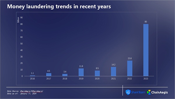 从 2016 年到 2023 年,加密货币洗钱总数达 1477 亿美元之多。从 2020 年开始洗钱金额以每年 67% 的速度不断增加,到 2022 年达到 238 亿美元,在 2023 年达到 800 亿美元之多,洗钱数目令人瞠目,加密货币反洗钱行动势在必行。