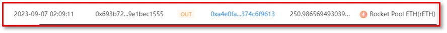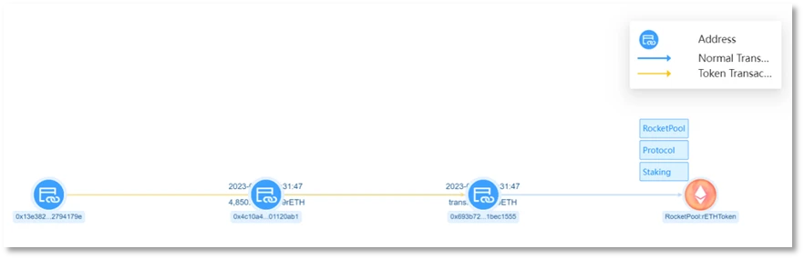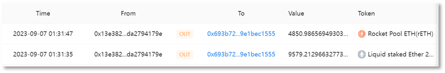 诈骗者地址 1 ( 0x4c10a4 )将受害者地址( 0x13e382 )账户中的 4, 850 rETH 转账至诈骗者地址 2 ( 0x693b72 ),金额约 841 万美元。