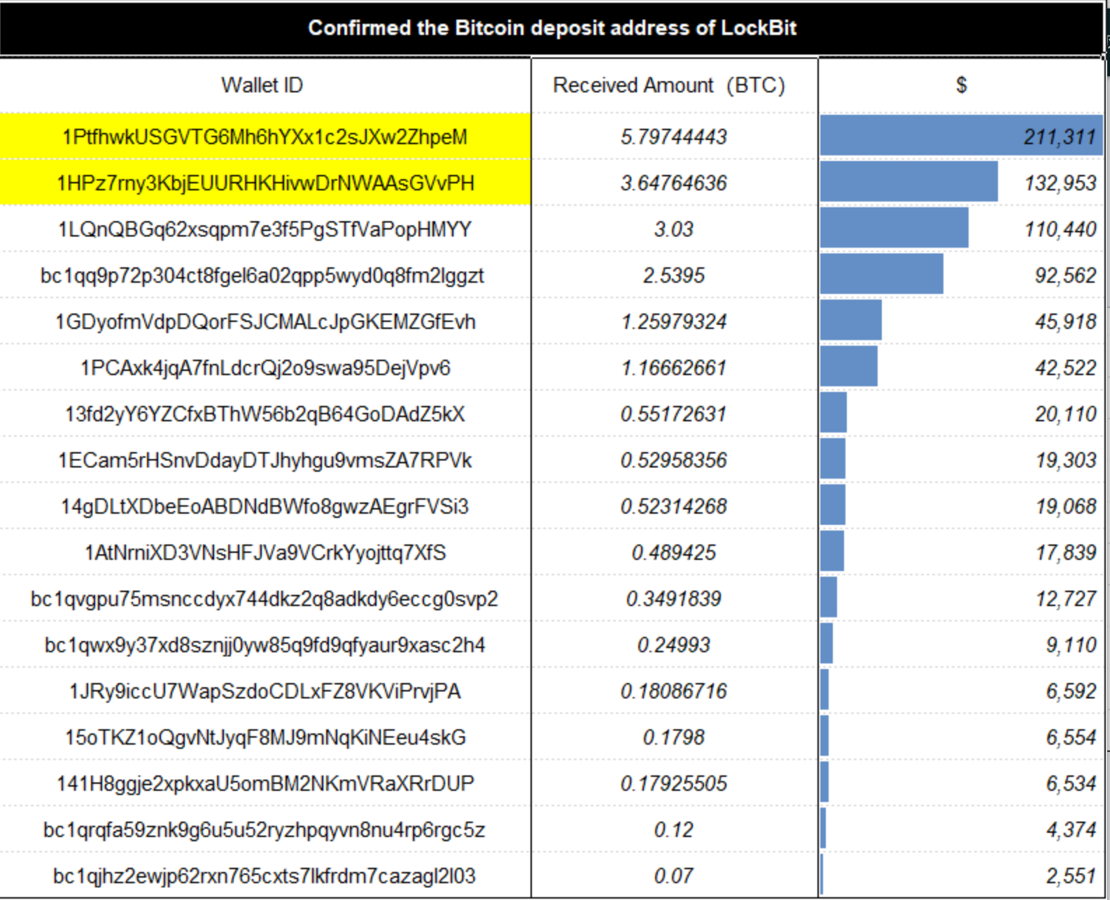 根据 ChainAegis 分析,LockBit 勒索软件大多采用 BTC 收取赎金,使用不同收款地址,部分地址和收款金额整理如下,单笔勒索的 BTC 在 0.07 个到 5.8 个不等,约 2, 551 美元到 211, 311 美元不等。