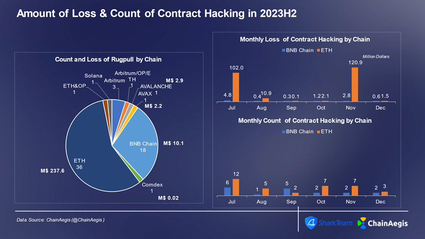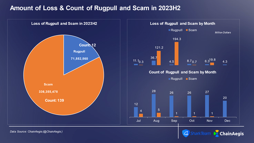 2023 年下半年,共计发生 139 起 Rugpull 事件和 12 起欺诈事件,分别造成 7155 万美元的损失和 3.4 亿美元的损失。
