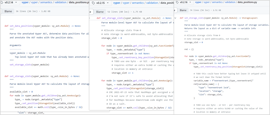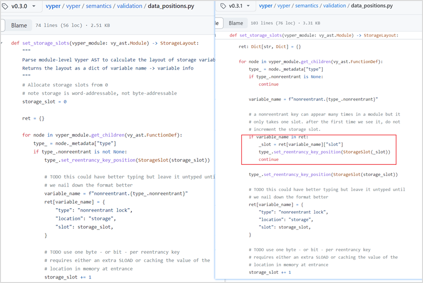 结合 Curve 官方的推文所说。最终,定位是 Vyper 版本漏洞。该漏洞存在于 0.2.15、 0.2.16、 0.3.0 版本中,在重入锁设计方面存在缺陷。我们对比 0.2.15 之前的 0.2.14 以及 0.3.0 之后的 0.3.1 版本,发现这部分代码在不断更新中,老的 0.2.14 和较新的 0.3.1 版本没有这个问题。