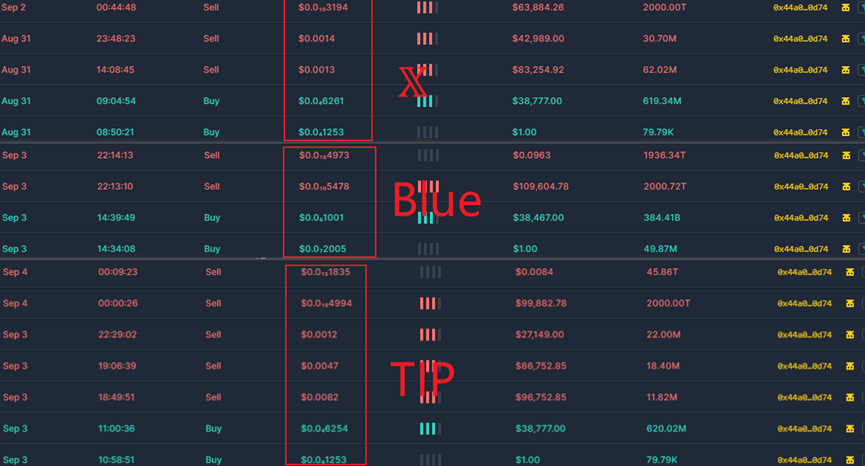 首先 X、TIP 和 Blue 代币所有者0x44A028Dae3680697795A8d50960c8C155cBc0D74用 1 U 兑换了相应的代币。然后,和假 Sei 代币一样。