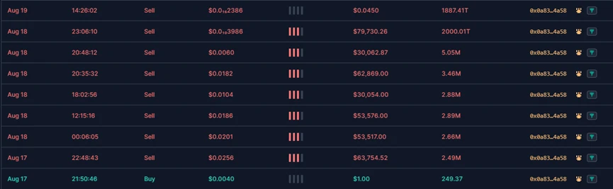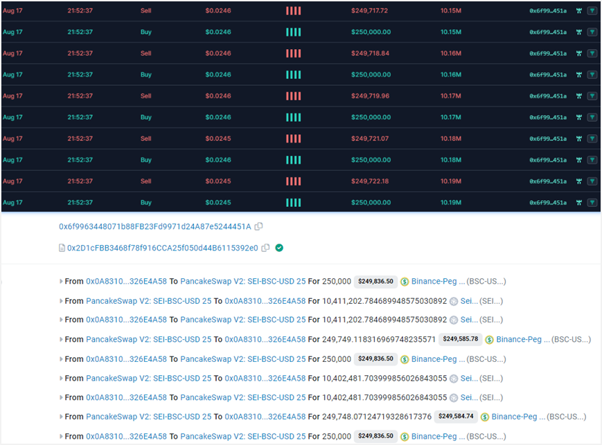 和假 SEI 一样,代币的价格达到一定的数值时,代币所有者进场 sell 操作进行 Rugpull。可以从下图看出,进场收割时间段和价格都不同。