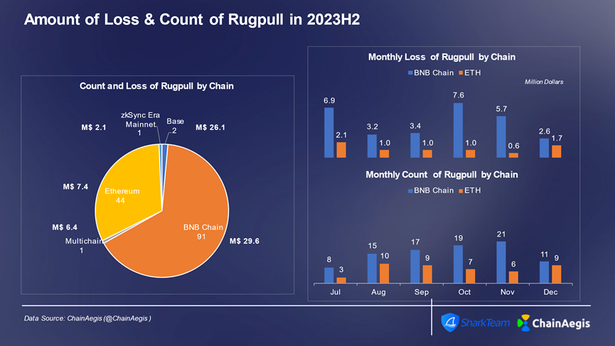 2023 年下半年 Rugpull 事件主要发生在 BNBChain 上,达到 91 次,占比超过 65% ,损失达到 2957 万美元,损失占比 41% 。以太坊(44 次)次之,损失 739 万美元。除以太坊和 BNBChain 外, 8 月 Base 链上发生 BALD Rugpull 事件,造成了严重损失,损失 2560 万美元。