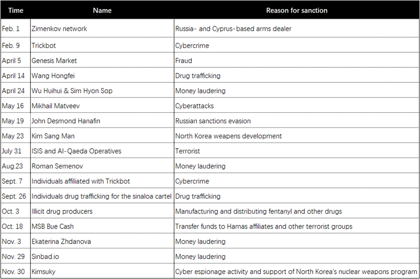 以下是 2023 年在美国受到制裁的与加密货币有联系的部分个人或实体的情况,以及 OFAC 制裁的原因。