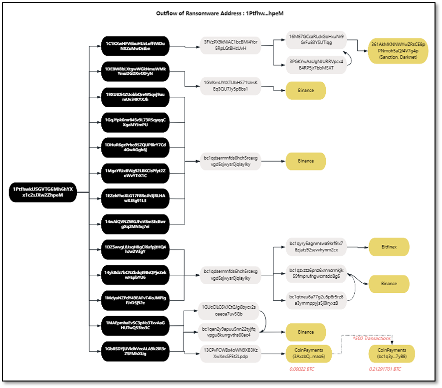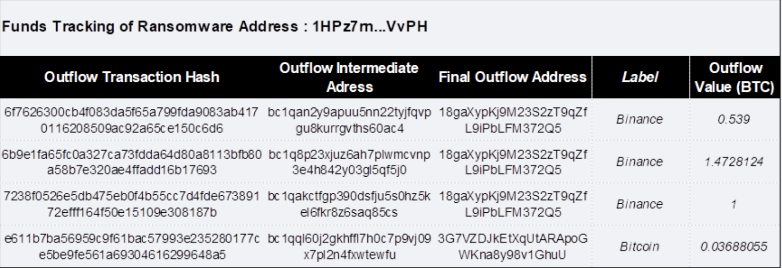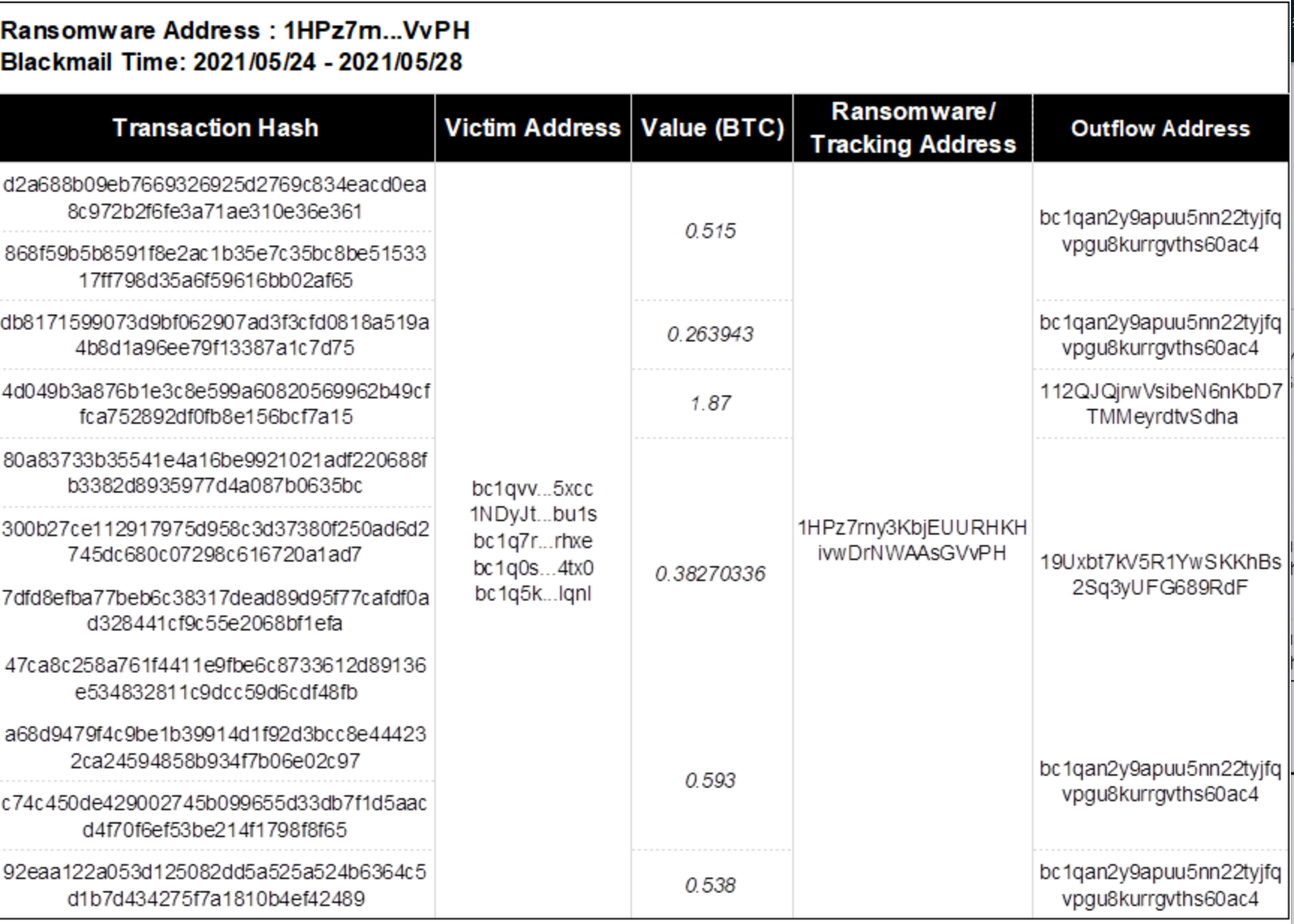 受害者在 2021 年 5 月 24 日至 2021 年 5 月 28 日期间,通过 11 笔交易向勒索运营商 LockBit 支付 4.16 个 BTC。随即,地址 2 ( 1HPz7rn...VvPH )迅速将勒索资金 1.89 枚 BTC 转到中间地址 1: bc1qan…0ac4 、 1.84 枚转到中间地址 2: 112QJQj…Sdha 、 0.34 枚转到中间地址 3: 19Uxbt…9RdF 。