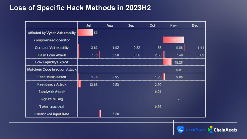 图:Web 3 2023 H 2 合约漏洞利用具体攻击手段发生笔数和损失金额
