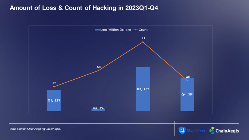 2023 年,Web3行业共经历了 940 多起大大小小的安全事件,同比 2022 年增长了超过 50% ,损失金额达到 17.9 亿美元。其中,第三季度发生的安全事件最多(360 起),损失最大(7.4 亿美元),损失同比 2022 年增长了 47% 。特别是 7 月份,共发生 187 起安全事件,损失金额达到 3.5 亿美元。