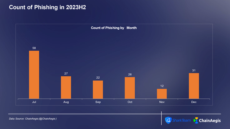 钓鱼攻击是一种网络攻击手段,旨在通过欺骗和诱导目标,获取其敏感信息或诱使其执行恶意操作。这种攻击通常通过电子邮件、社交媒体、短信或其他通信渠道进行,攻击者会伪装成可信任的实体,如项目方、权威机构、KOL 等,以引诱受害者提供私钥、助记词或交易授权。与合约漏洞攻击类似,钓鱼攻击在Q3呈现高发高损失状态,总共发生 107 起钓鱼攻击,其中 7 月份发生 58 起。