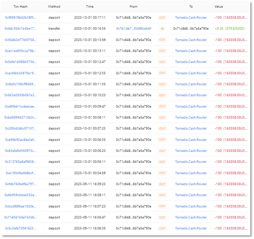 随后中间地址( 0x71C848 )分别在 9 月 11 日和 10 月 1 日,通过两次资金转移,总计 20 笔交易,每笔转移 100 ETH,总计转移 2000 ETH 至 Tornado.Cash。