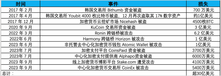目前已明确统计到的 Lazarus 攻击加密领域的安全事件和损失如下: