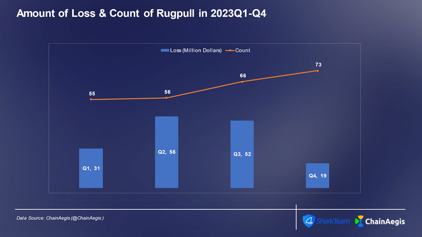 2023 年 Rugpull 欺诈事件发生的频率呈现较为显著的上升趋势,Q4达到 73 笔,损失金额为 1, 900 万美元,平均单笔损失约为 2.6 万美元,全年 Rugpull 欺诈损失金额中占比最高的季度是Q2,其次是Q3,损失占比均超过 30% 。