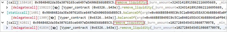 (3)随后攻击者( 0x6ec21d18 )从 pETH-ETH-f( 0x9848482d )流动性池中重复地移除流动性。