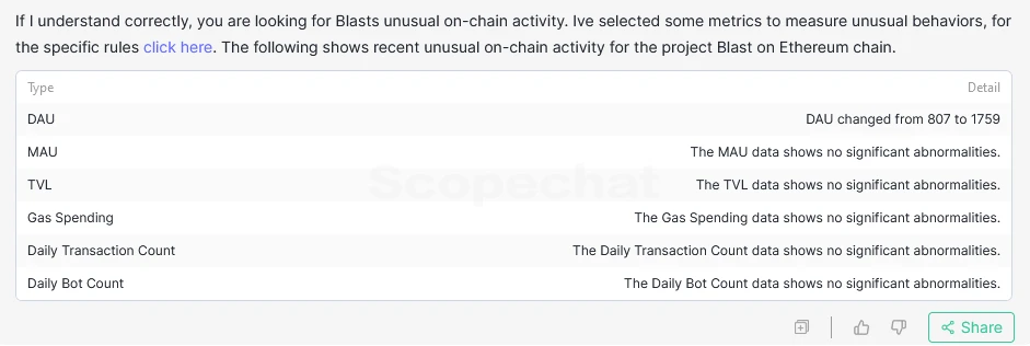 Scopechat 表示:“如果我理解正确的话,您正在寻找 Blasts 异常的链上活动。我选择了一些指标来衡量异常行为,具体规则请点击这里。以下显示了以太坊链上 Blast 项目最近异常的链上活动。”