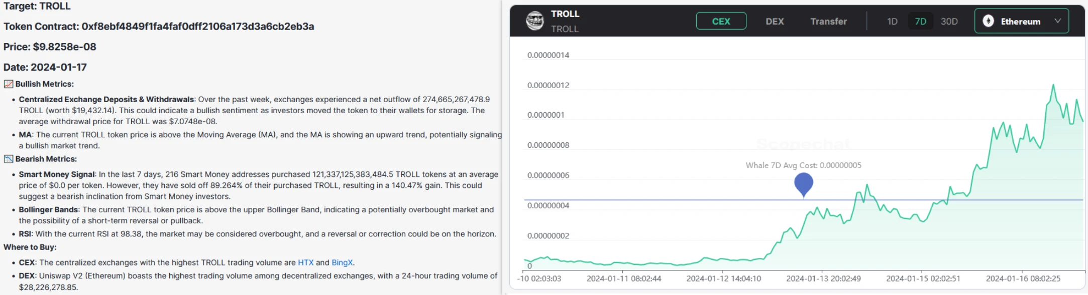该数据用于交易分析具备一定意义,但对于这个具体提问,Scopechat 问题识别错误。 截止发文时,包括 Bitget、BitMart 等多家 CEX 已上架 TROLL。