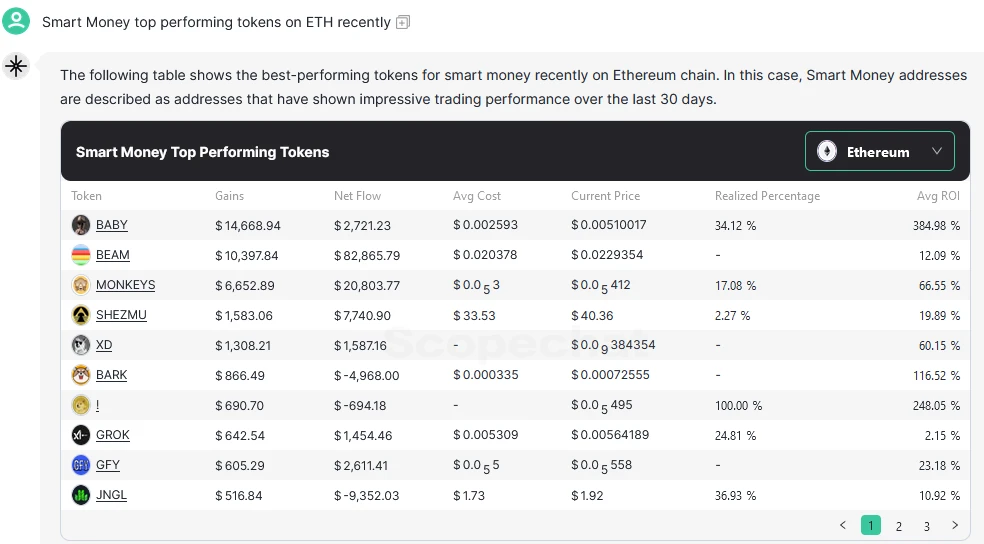 Scopechat 直接给出了一系列代币列表,按照盈利降序排名。根据表单表现形式,预计是基于聪明钱包的平均入场价格和当前价格,计算出平均盈利情况所得出的。但盈利金额都较小,可参考性存疑。