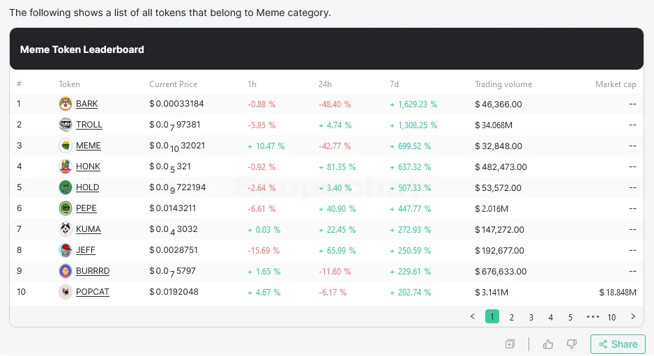 在进行上一问题的提问之后,Scopechat 表示,提问者可能是在进行交易的尽职调查或逻辑支撑,因此推荐了三个问题“TROLL 的总结”、“给出相关 Meme 叙事的代币列表”、“TROLL 的主要交易”,本处选取问题 2 ,Scopechat 给出了非常全面的 Meme 代币列表。