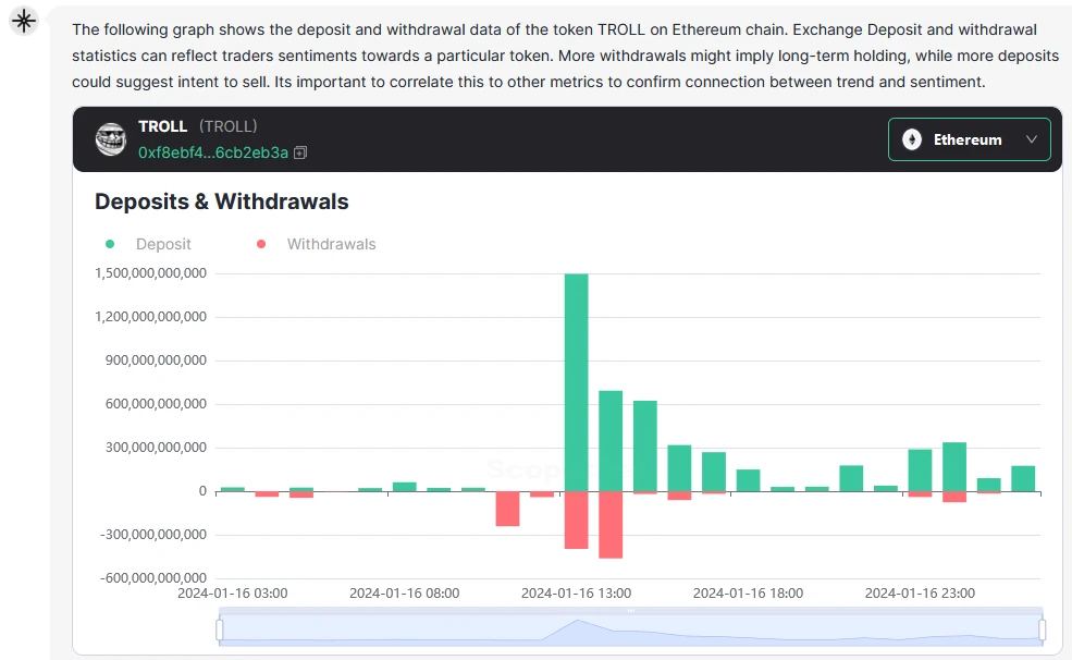 Scopechat 的回答为:下图为以太坊链上代币 TROLL 的充值和提现数据。交易所存款和取款统计数据可以反映交易者对特定代币的情绪。更多的提款可能意味着长期持有,而更多的存款可能意味着出售的意图。将其与其他指标相关联以确认趋势和情绪之间的联系非常重要。