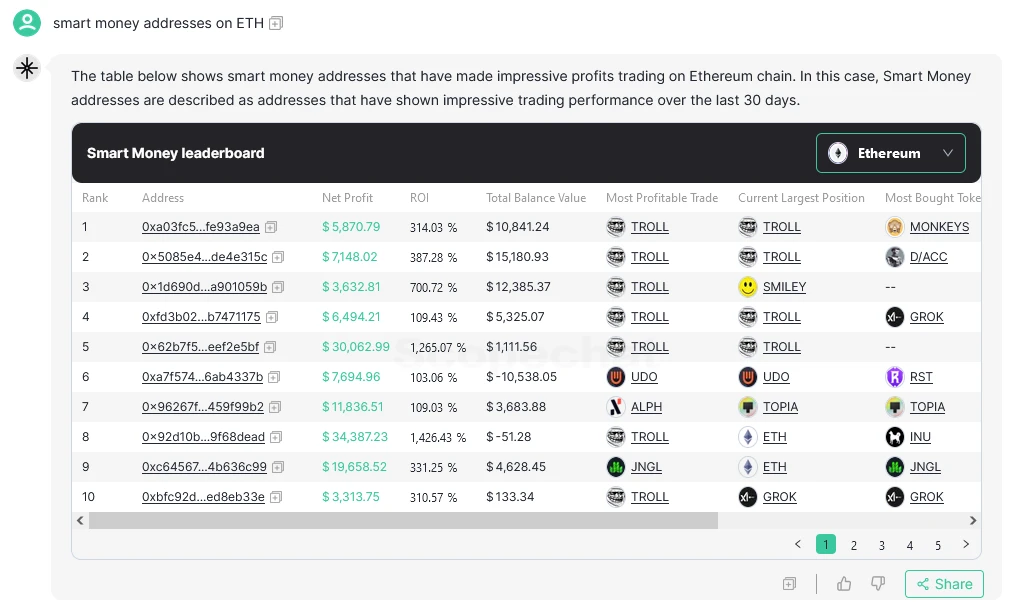 Scopechat 给出的聪明钱包地址,多数都交易了 TROLL、SMILEY 等代币,符合当前的热门代币情况。但近期报道 TROLL 盈利超百万美元的钱包并不在其列。
