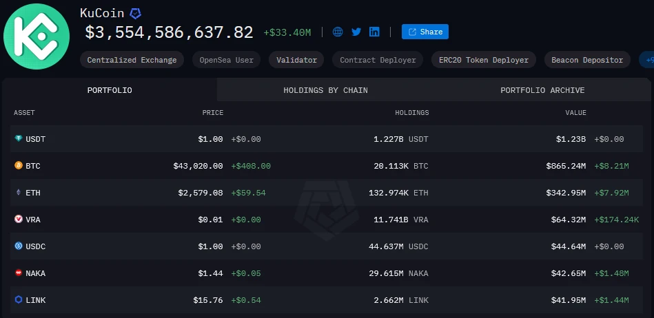 以上数据显然非正确数据,另可基于 Arkham 得到 KuCoin 实体持有的主要代币如下: