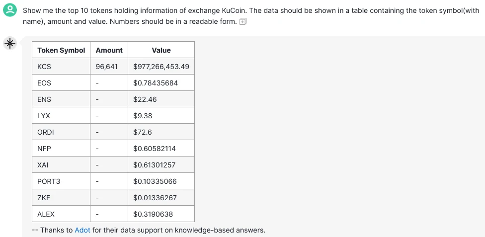 再次输入同样问题后,Scopechat 表示基于 Adot(另一Web3 AI 查询引擎)有如下数据。