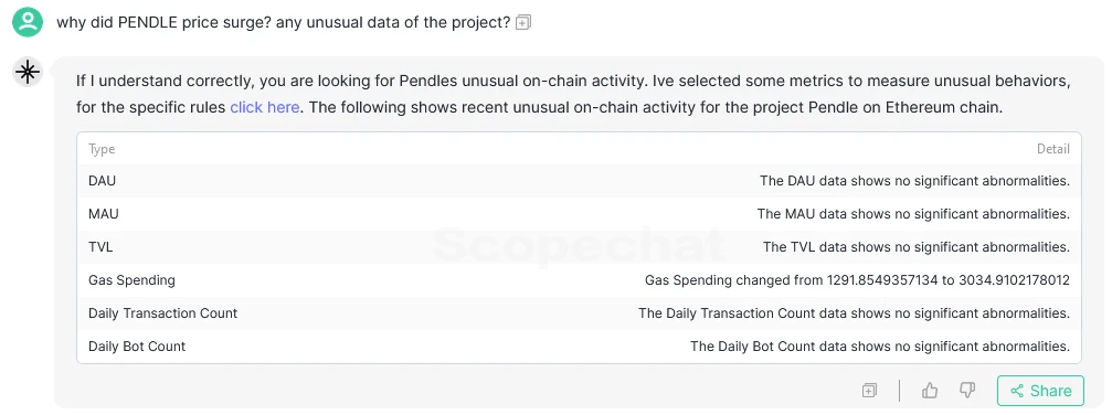 首次提问的原文为“why did PENDLE price surge? any unusual data?”,Scopechat 给出了币价走势图。在第二次提问中强调了“项目的”异常数据,Scopechat 采用前一小节的相同模板进行回答。