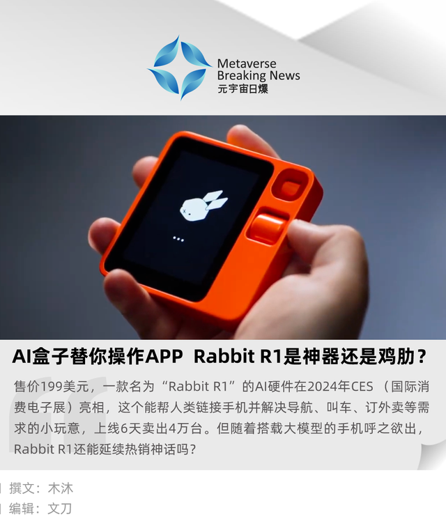 当AI Agent成为大模型的具体应用场景后,渡鸦前创始人兼 CEO 吕骋新创立的 Rabbit.tech 造出了硬件AI助手Rabbit R1,这款设备在2024 CES亮相后,吸引来的不仅是目光,还有实打实的销量。