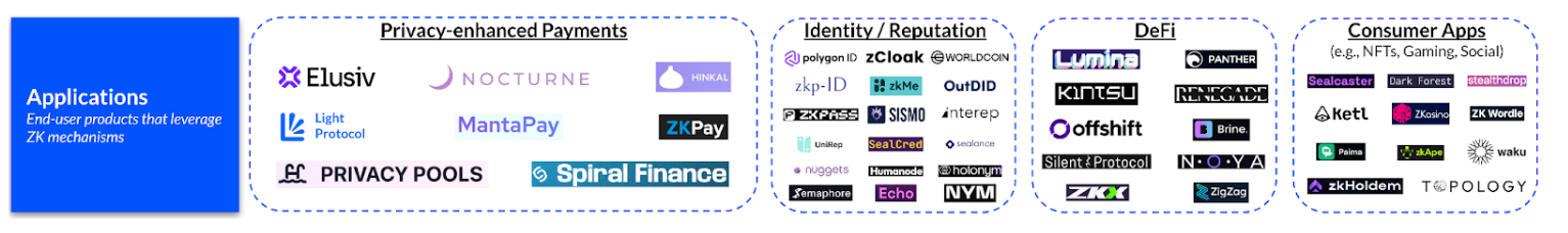 在 ZK 基础设施和网络层之上,出现了一批利用零知识证明进行链上支付、身份验证、私密但合规的 DeFi 和消费者用例的终端用户应用程序。