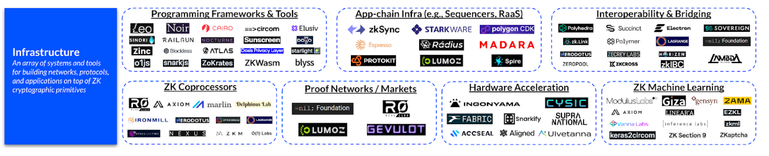 1)基础设施,即用于在零知识原语之上构建协议/应用程序的工具/硬件